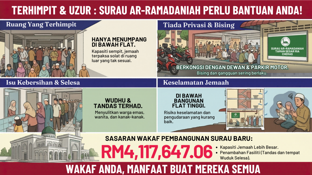 Terletak di bawah blok Pangsapuri Taman Segar Ria, Cheras, Surau Ar-Ramadaniah kini berada dalam keadaan yang sangat mendesak. Bayangkan suasana ibadah kami setiap hari.